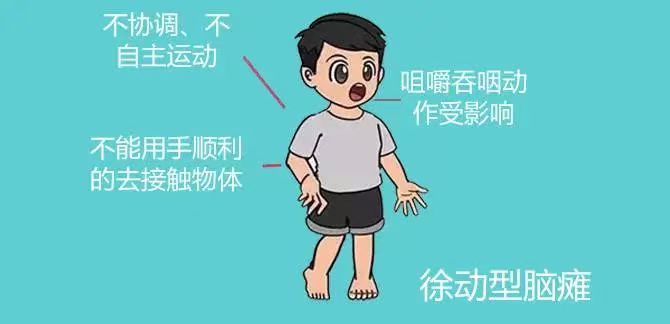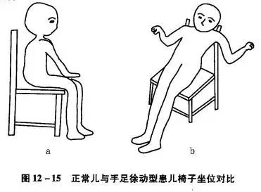 手足徐动型脑瘫患儿最主要的特征为肢体的不随意运动,安静时消失,活动时出现。表现奇特,挤眉弄眼,手不能准确抓物,常向相反方向用力。头的控制能力差,颈部也有不随意运动,多有摄食及构音障碍。