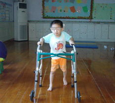 4、足尖翘起:平衡功能障碍,立位时重心在足跟部,为了维持平衡,患儿常常足尖翘起,加大足距以扩大支撑面积,向前弯腰以弥补重心后移。