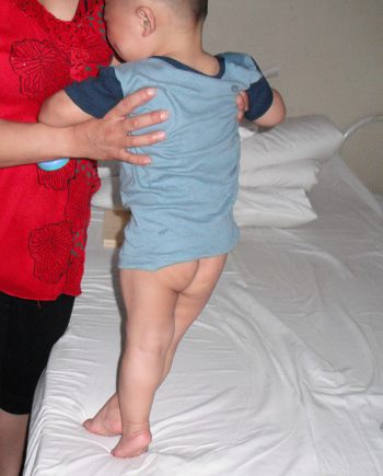 在自己手臂的支撑下坐起,把它喜欢的物品放在面前引起注意,藉以保持较长时间的坐姿,渐渐减少支撑,较后独坐。大人可拉脑瘫儿一只手,诱使他从座位过度到双腿为脆姿,然后再让他站起来。孩子抓住小床栏杆时家长把双手放在他掖下支撑站立,逐渐减少帮助,让他自己保持平衡。