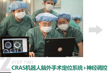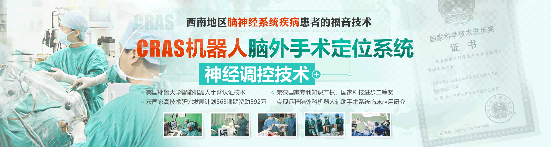 CRAS机器人脑外手术定位系统+神经调控技术,是借助目前医学界最先进的航天机器人手臂,运用微侵袭神经外科技术(CT脑立体定向、神经导航结合显微手术等)进行病灶靶点定位,建立与靶点对应的三维坐标体系快速精确定位脑内病变的神经细胞核团或神经纤维,采用该机器人手臂的精密传感器进行全方位分析,将仅0.3mm的射频消融针探入脑部病灶,实施病灶损毁、神经细胞核团或神经纤维功能调控;同时,机器人手臂还会将正常功能的T神经细胞准确无误的植入受损病灶,激活和修复该区域的神经细胞,从而修复、激活已经受损的大脑皮层,恢复大脑神经细胞功能的再平衡,不仅从根本上治疗了脑病,且还让患者康复到了接近正常人的水平。