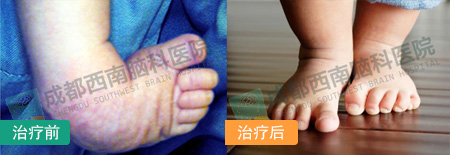 治疗:共住院7天,施行1>双侧内收肌离断术;2>双侧跟腱延长术;3>双侧胫后肌腱延长术;4>双侧胫前肌腱移位术。术后双足背伸于功能位,行管型石膏外固定,对症支持治疗,配合早期床上功能康复锻炼。
