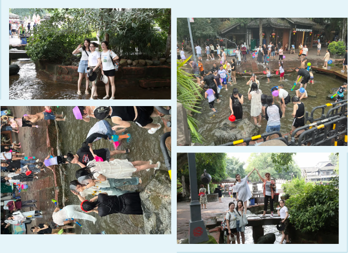 夏末的黄龙溪怎能少了水的乐趣?在古镇的河畔,医师们卸下平日的严谨与庄重,化身为孩童般的纯真,尽情享受着水带来的清凉与欢乐。无论是悠闲地坐在竹筏上漂流,还是在浅水区嬉戏打闹,那份由内而外的轻松与愉悦,成为了这次旅行中最难忘的瞬间。
