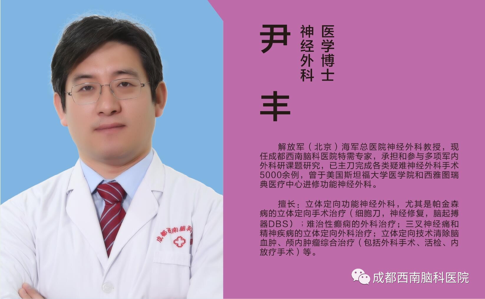 第十二届全国功能神经外科学术会议暨中华医学会功能神经外科年会在2017年7月28-30日在宁夏银川隆重召开。本次大会由中华医学会神经外科学分会功能神经外科学组、王忠诚医学基金会主办,宁夏医科大学总医院神经外科、宁夏颅脑疾病重点实验室承办。成都西南脑科医院特需医生,解放军(北京)海军总医院神经外科尹丰教授也在本次邀请嘉宾的名单中。