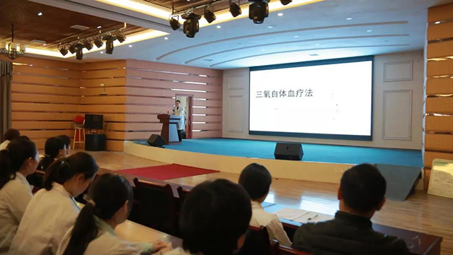 程俊主任指出,医用臭氧临床治疗作用主要有:提高免疫力功能,增强机体抵抗能力;降低血液粘稠度和调制代谢;扩张小血管,改善微循环;提高细胞活力,改善机体代谢;清除体内自山基分子,使细胞抗氧化能力增强;广谱杀菌作用;辅助肿瘤治疗。讲座后,自由提问环节,程俊主任还结合医院实际,就三氧自体血疗法在治疗出血性脑中风、缺血性脑中风、帕金森症、肿瘤辅助治疗等问题做了深入探讨。