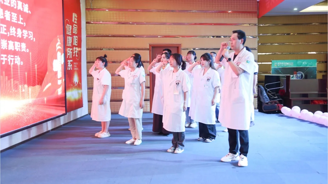 随后,在杨勤光医生的领誓下,十余位医生代表高举右手握拳,庄声宣誓,表达了他们投身医疗事业,维护医学圣洁的决心。
