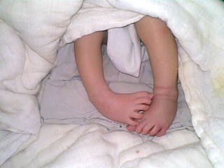 2、松软型、畸形较轻。足跟大小接近正常,踝及足背外侧有轻度皮肤皱褶,小腿肌肉萎缩变细不明显。大的特点是在被动背伸外翻时可以矫正其马蹄内翻畸形,能使患足达到或接近中立位。此型畸形较松软,容易矫正,治疗易巩固,不易复发,预后好。该型属于宫内位置异常所致。